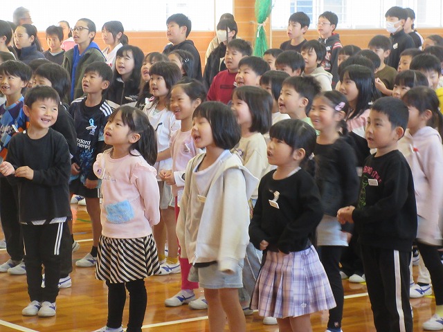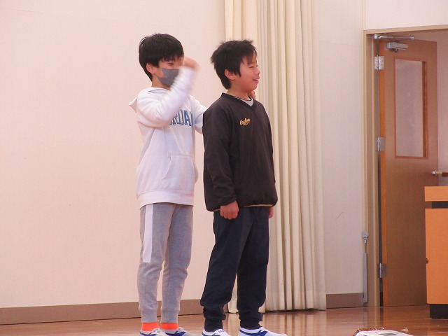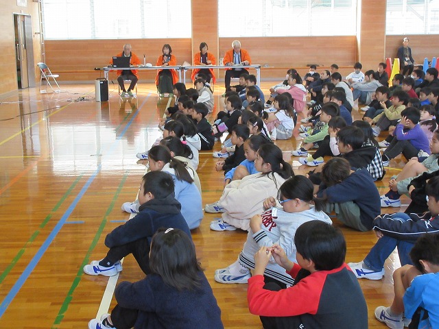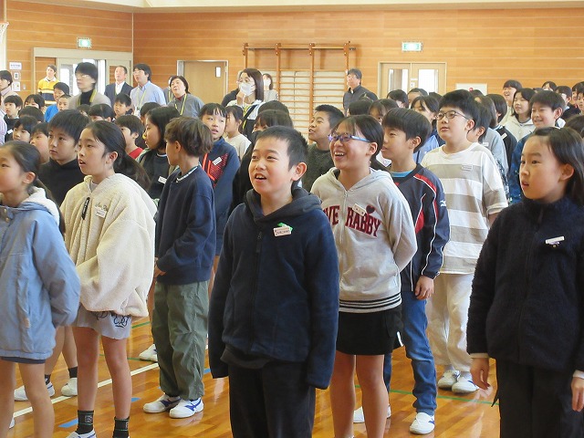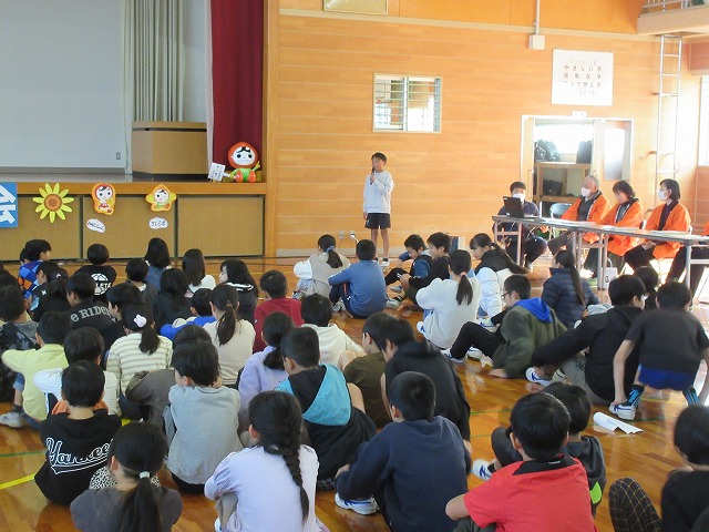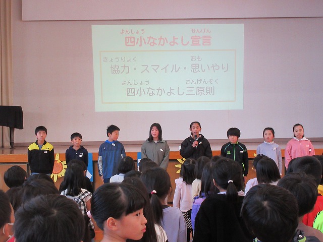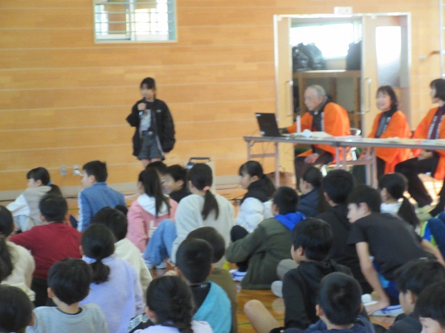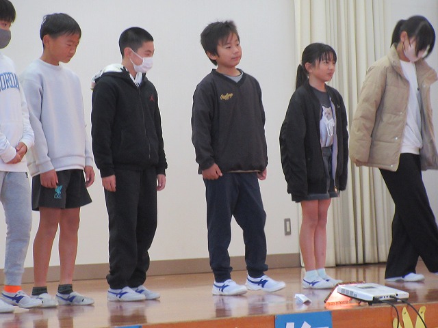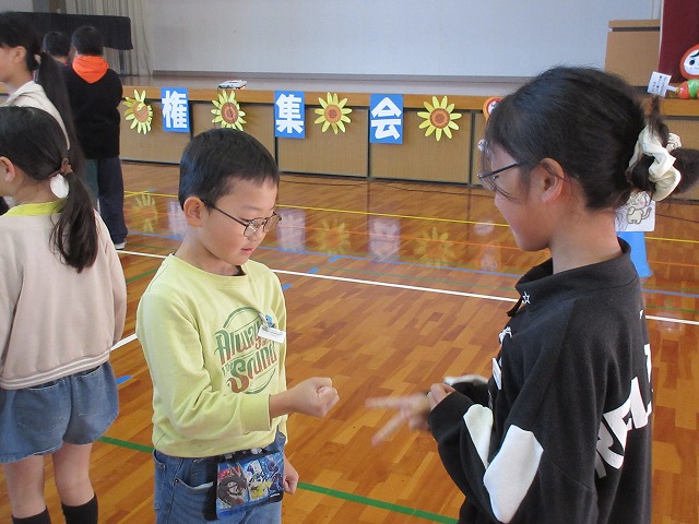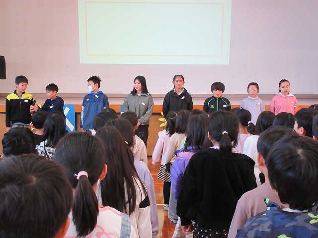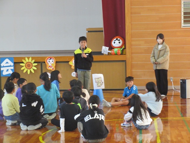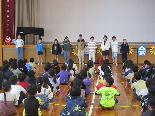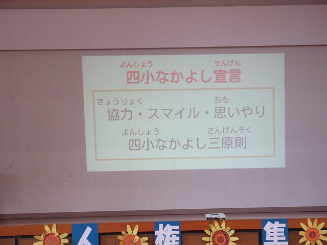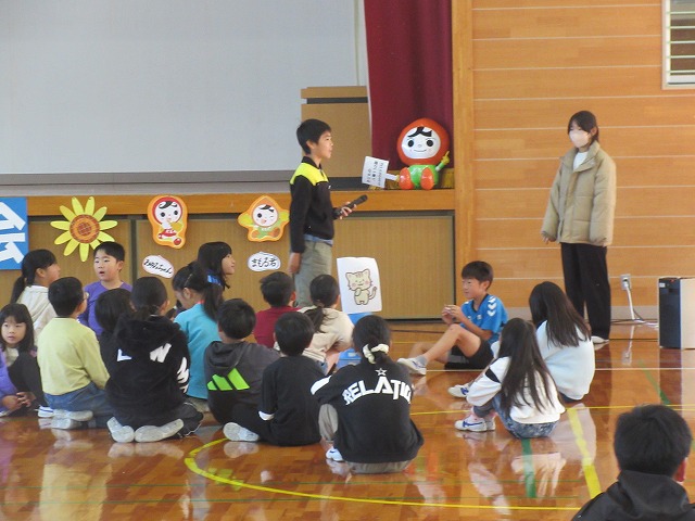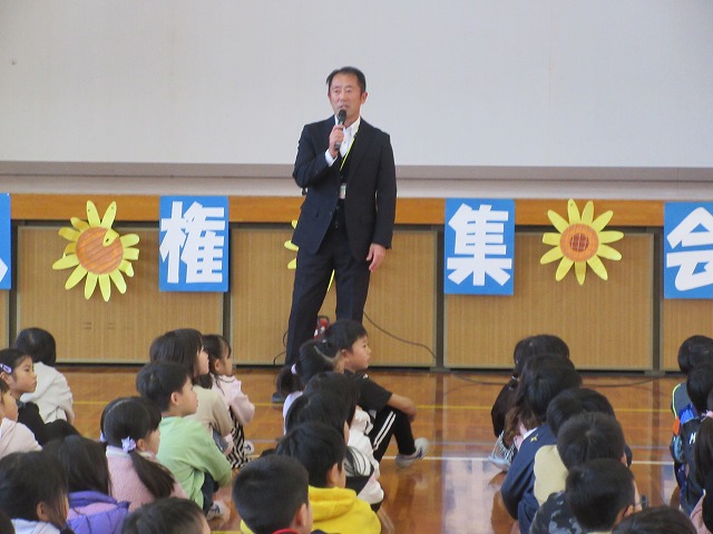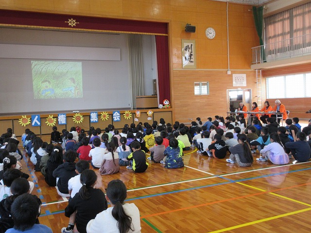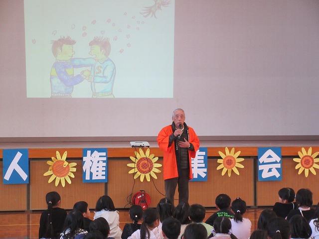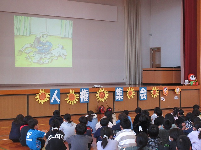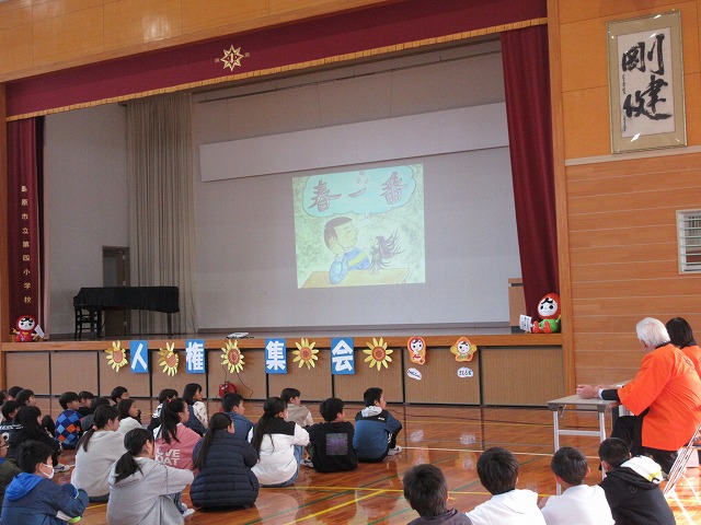 12月2日(火)2校時に島原市の人権擁護委員の皆さまを招いて「人権集会」を開きました。まず初めに校長先生から「自分を大切にする 友達を大切にする 人との違いを認める」という3つのお願いがありました。その次に人権擁護委員の方による自作の紙芝居「春一番」を見せてもらいました。そのお話からは、自分にそのつもりがなくても相手を傷つけてしまうことがあるということを学びました。その後は全校児童で「じゃんけん肩叩き」をしました。曲に合わせて移動し、出会った相手とじゃんけんをして負けた方が相手の肩を叩いてあげるというゲームです。みんな笑顔で肩を叩き合っていました。そしてみんなで話し合って決めた「四小人権宣言」を大きで声で発表し、「Smile」を合唱して終わりました。これからの子どもたちの言葉遣いや友達との接し方を見守っていきたいと思います。ご家庭でも人権集会の様子を話題にされてみてください。
