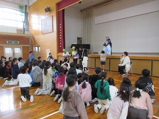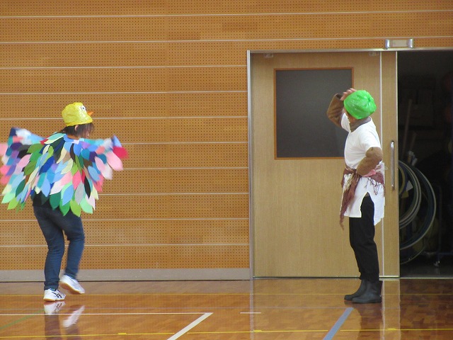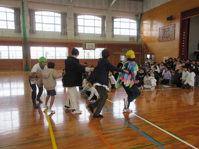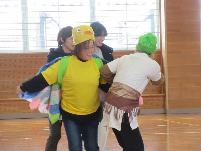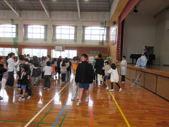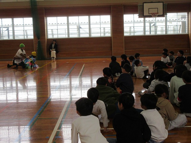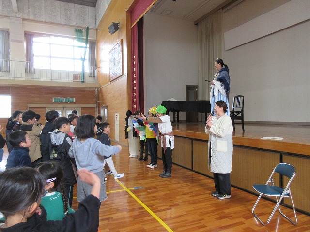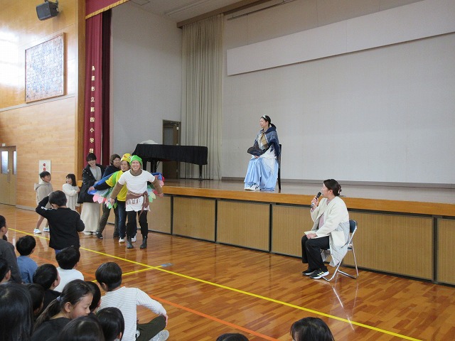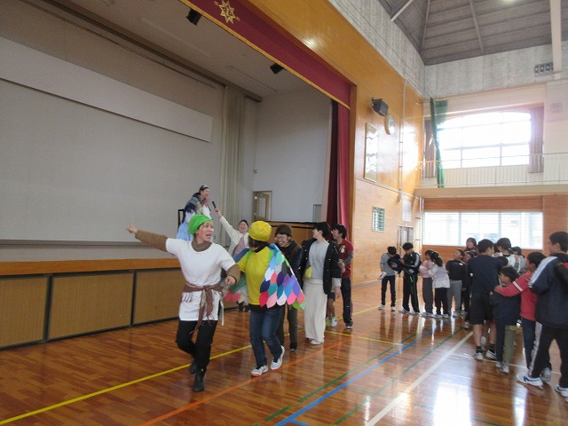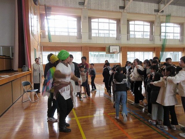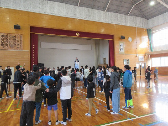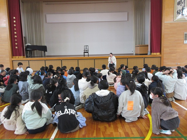 12月4日図書ボランティア「クローバー」の皆さんによる「お話し会」がありました。お話は、「金のガチョウ」でした。持久走大会で頑張ったみんなへのご褒美として、楽しいお話をプレゼントしてくださいました。お話「金のガチョウ」では、笑わないお姫様を笑うようにがんばりましたが、なかなか笑ってくれません。そこで、四小のみんなの力を借りて・・・  子どもたちも参加してのじゃんけん列車で長い列ができ、お話の世界に飛び込み、長い列をつくりました。すると、お姫様は笑ってくれました。子どもたちも楽しめてスマイルいっぱいでした。子どもたちの参加型の楽しいお話をありがとうございました。