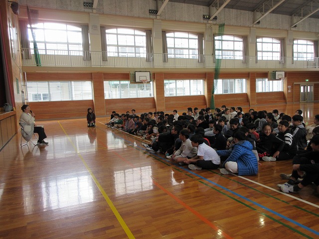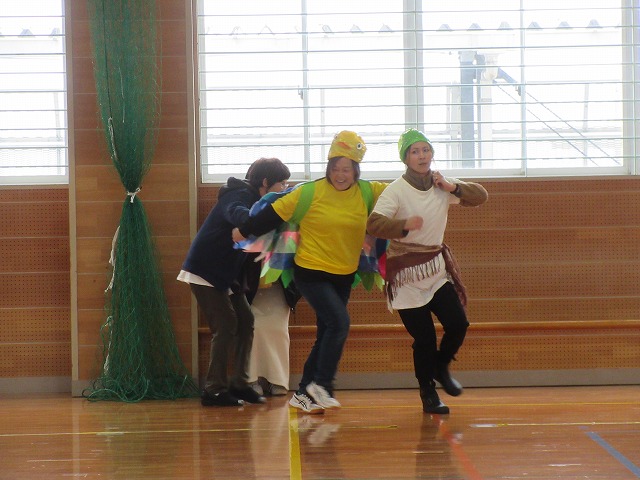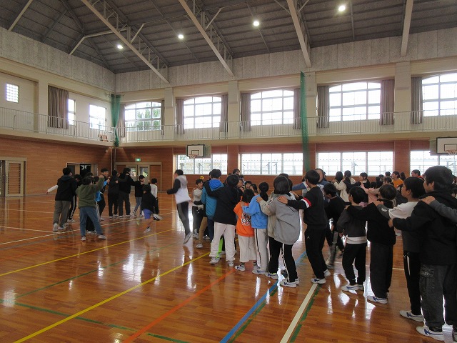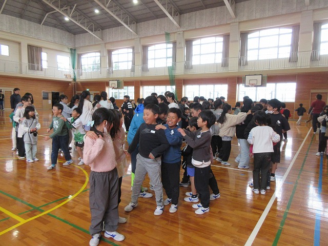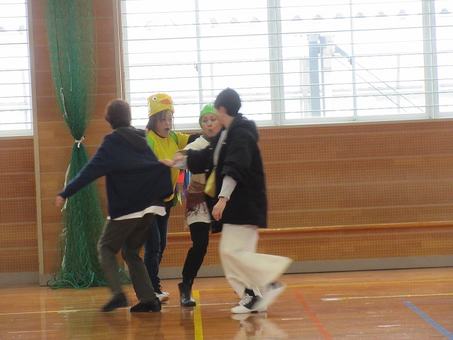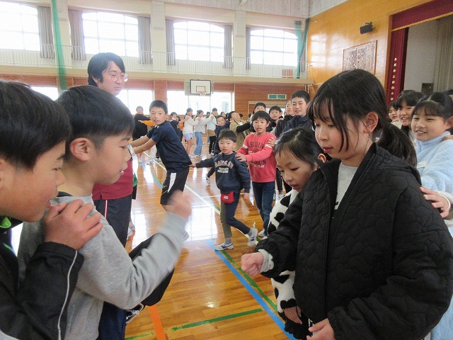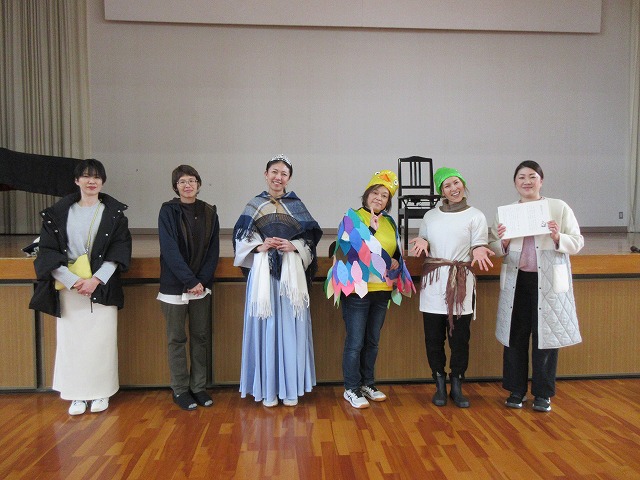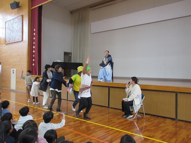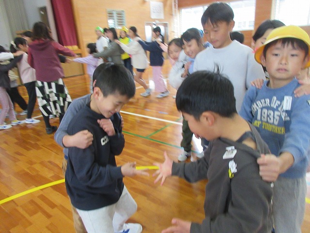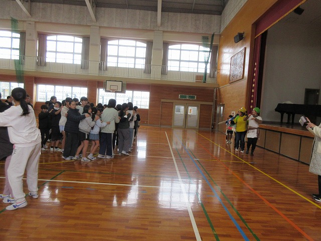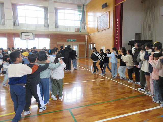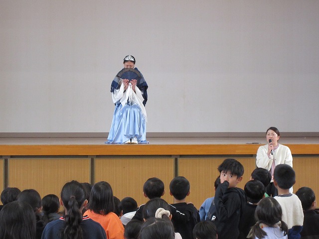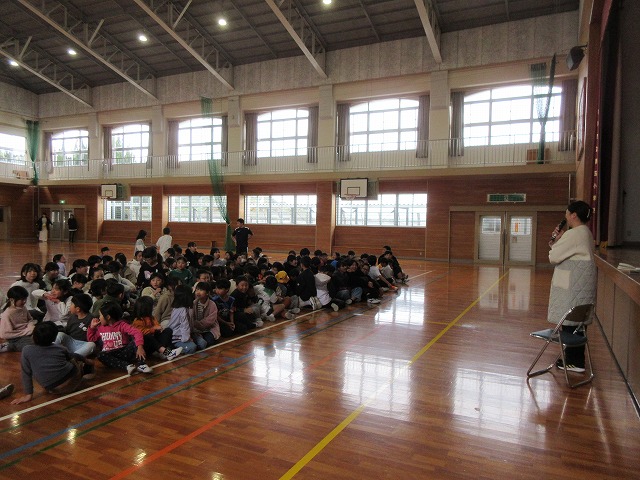 12月4日図書ボランティア「クローバー」の皆さんによる「お話し会」がありました。お話は、「金のガチョウ」でした。持久走大会で頑張ったみんなへのご褒美として、楽しいお話をプレゼントしてくださいました。お話「金のガチョウ」では、笑わないお姫様を笑うようにがんばりましたが、なかなか笑ってくれません。そこで、四小のみんなの力を借りて・・・  子どもたちも参加してのじゃんけん列車で長い列ができ、お話の世界に飛び込み、長い列をつくりました。すると、お姫様は笑ってくれました。子どもたちも楽しめてスマイルいっぱいでした。子どもたちの参加型の楽しいお話をありがとうございました。