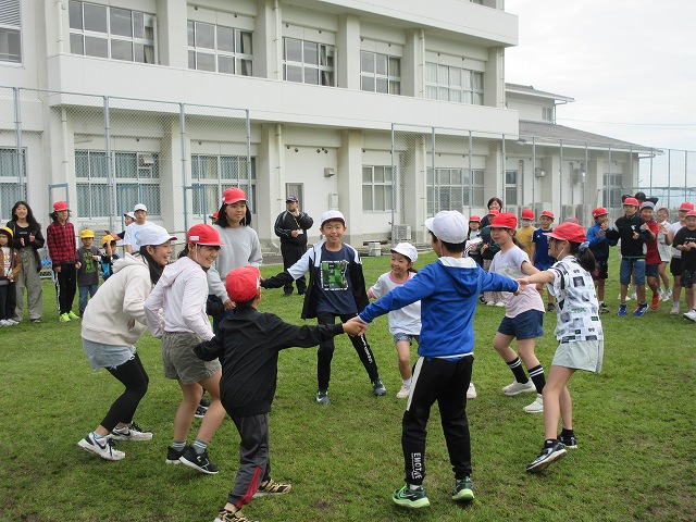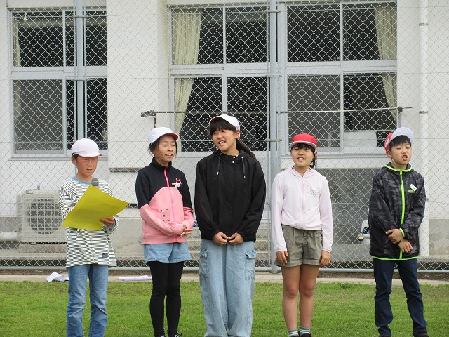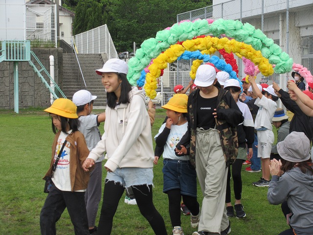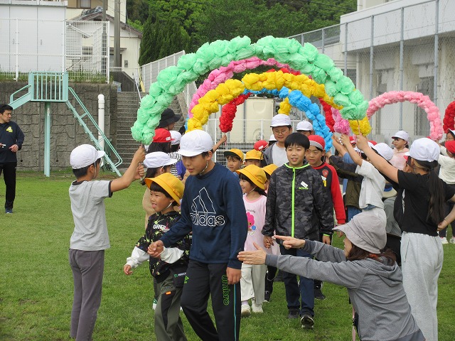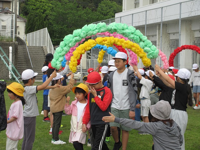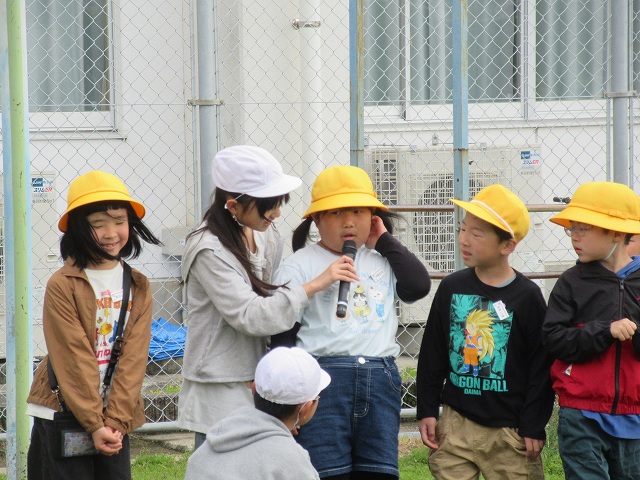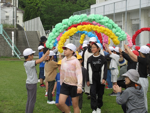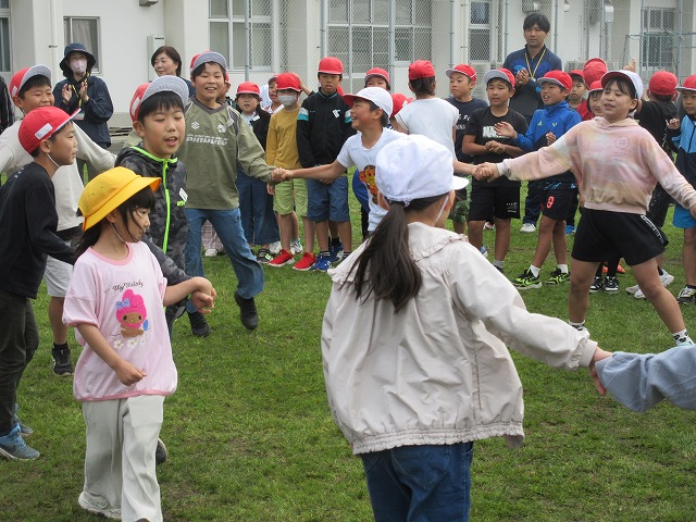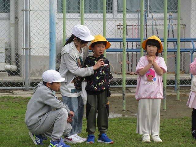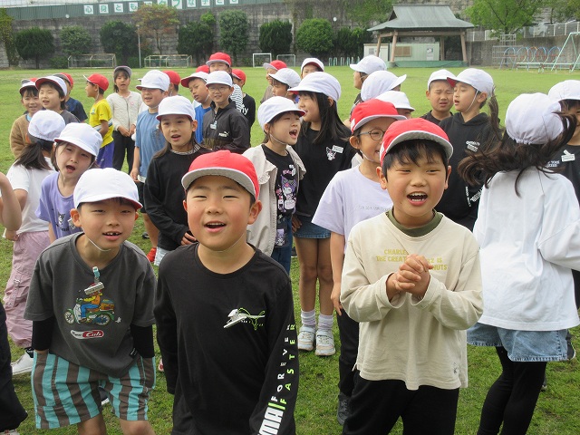 4月24日(金)、少し肌寒さを感じる天気の中、運動場で「1年生を迎える会」を行いました。全校児童が集まり、あたたかな拍手の中、1年生が元気よく入場しました。会では、1年生一人一人が名前や好きなことなどをしっかりとスピーチし、全校のみんなから大きな拍手が送られました。少し緊張しながらも、一生懸命に話す姿がとても立派でした。その後は、みんなで楽しくゲームを行い、学年をこえてたくさんの笑顔が広がりました。「動物園に行こうよ」のゲームでは、先生方も一緒に参加し、声をかけ合いながら手をつなぎ、大きなグループを作って盛り上がりました。運動場いっぱいに元気な声と笑い声が広がり、あたたかな時間となりました。