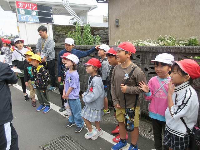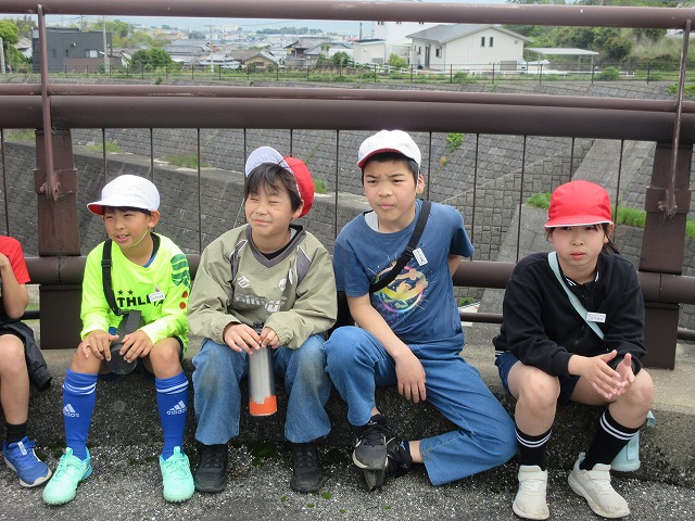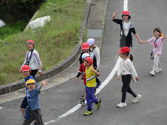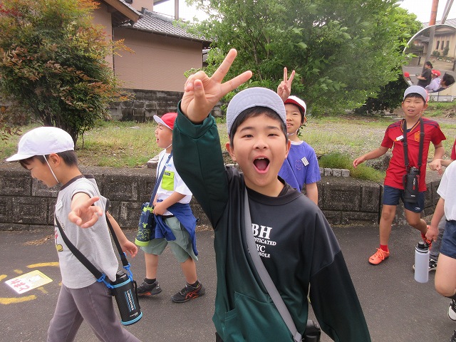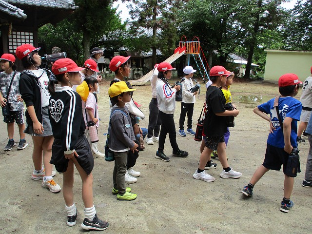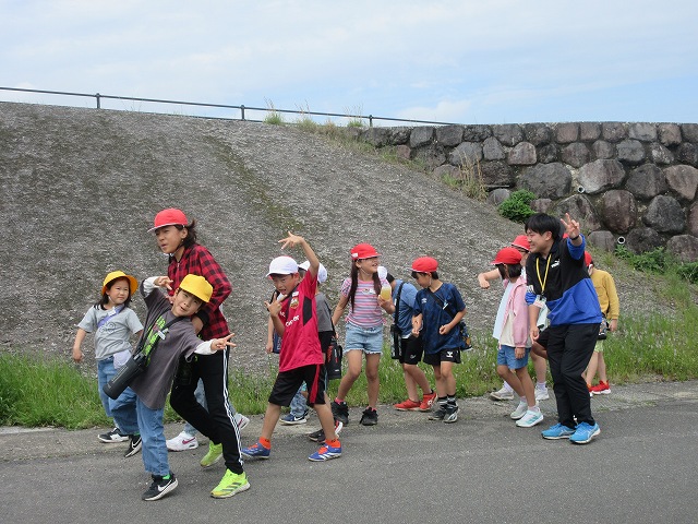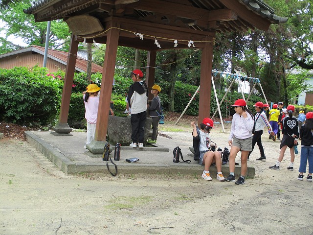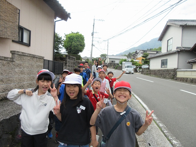 歓迎集会終了後、縦割り班ごとに校区内を回る「杉谷地区散策」に出発しました。子どもたちは友達と話したり、町の発見をしたりしながら元気よく歩きました。途中、熊野神社や河原(こうら)橋などいくつかのポイントで6年生が考えたキーワード探しクイズに挑戦しました。