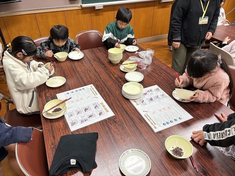 昼休みには、正しいはしのもち方で小豆をつかむ「おはしつかみチャレンジ」を行いました。