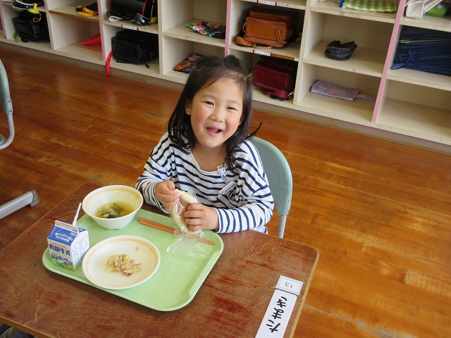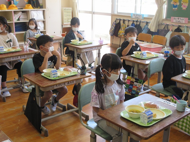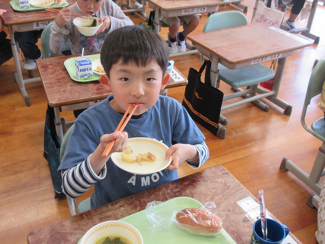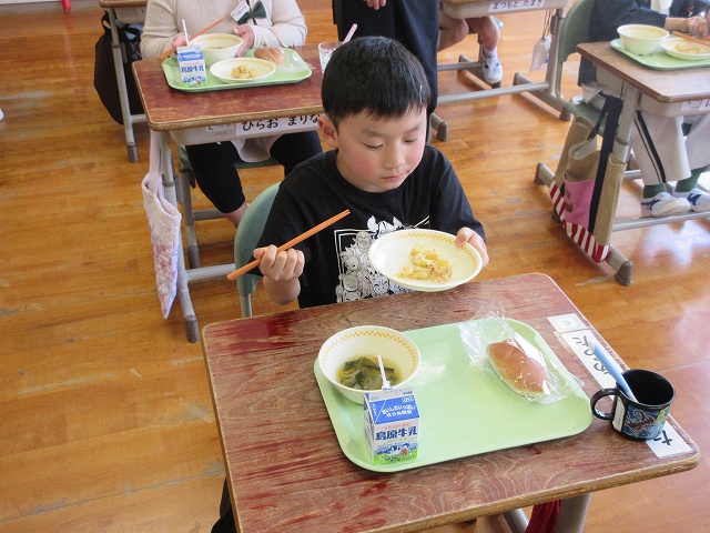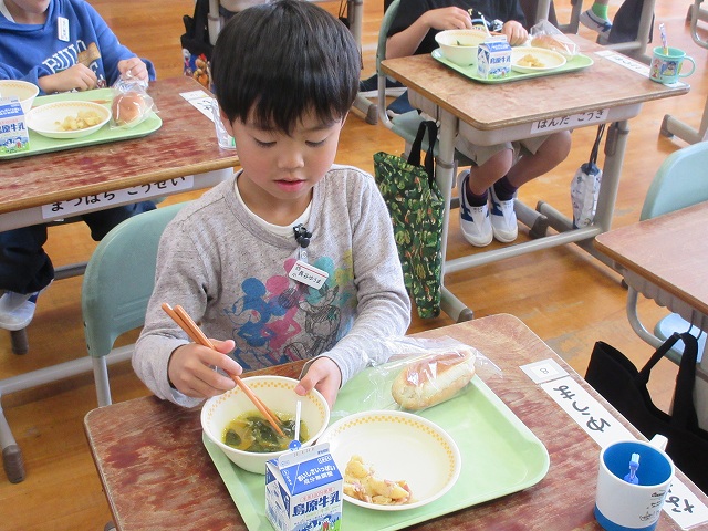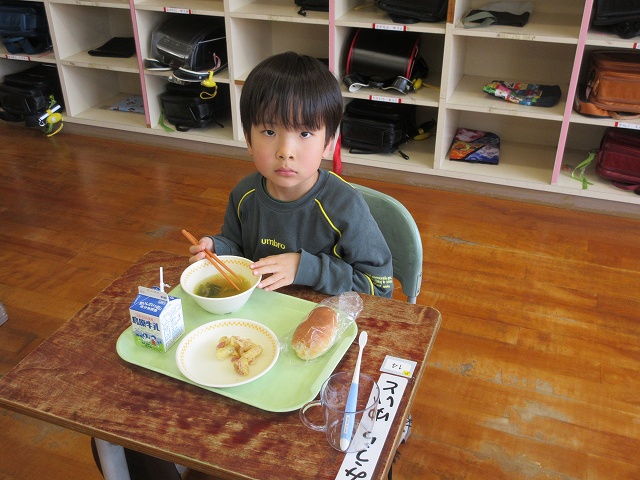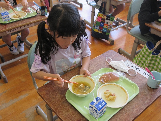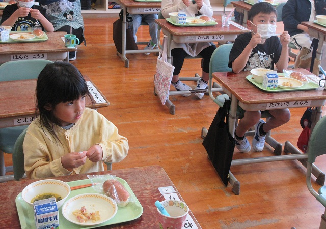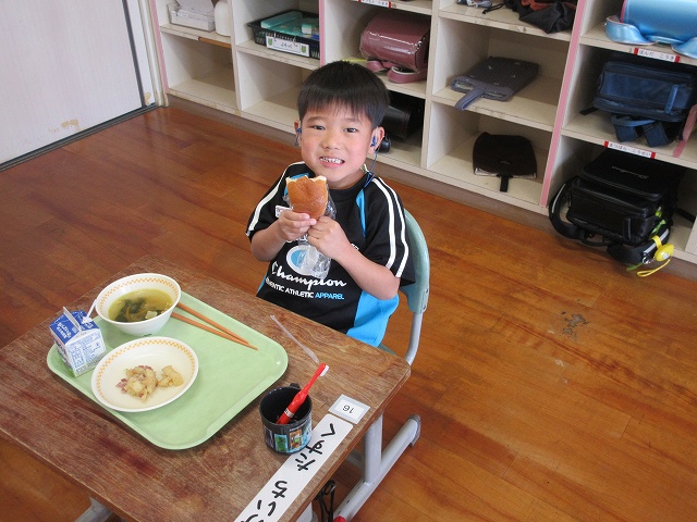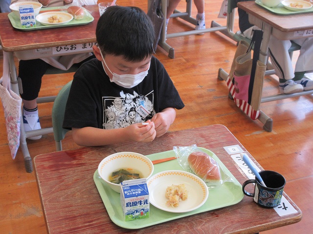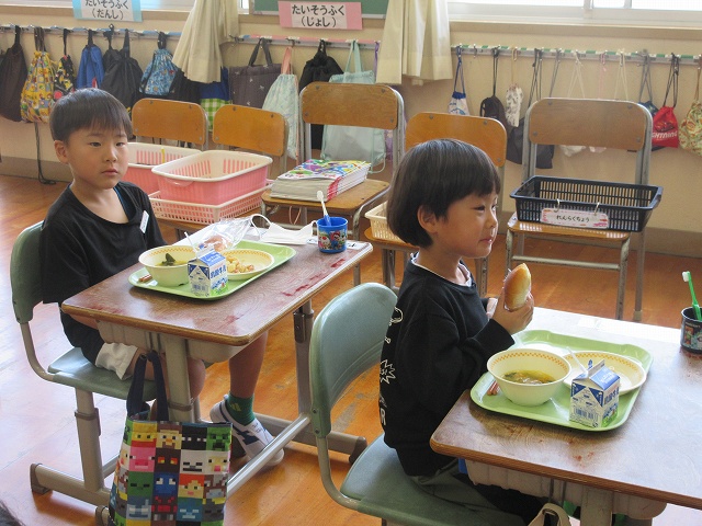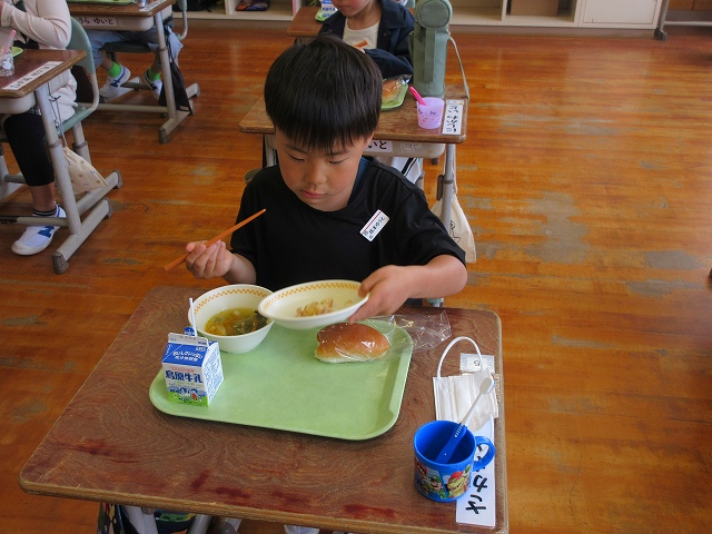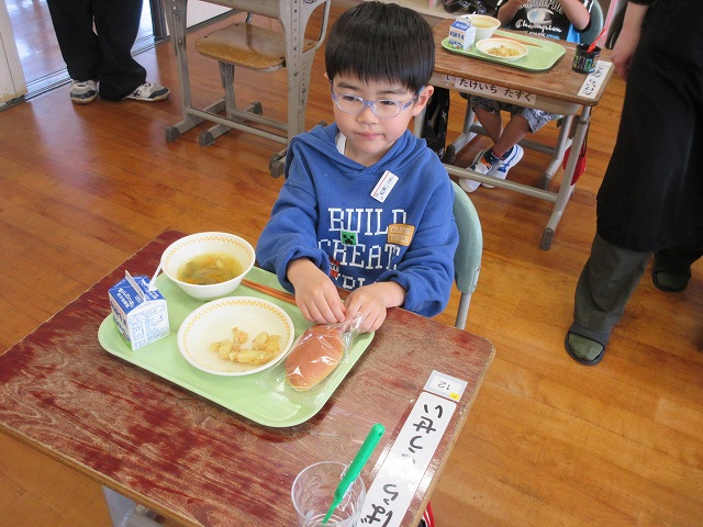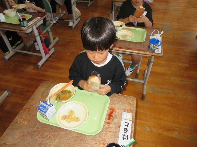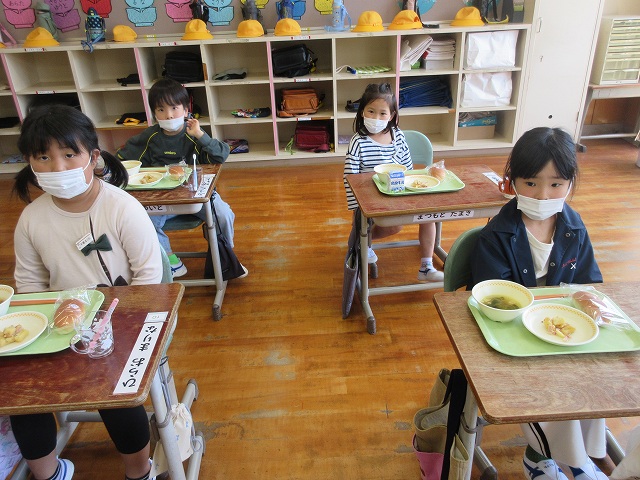 今日から1年生の給食がスタートしました。はじめての給食のメニューは、米粉パン、牛乳、オニオンスープ、児童に人気のジャーマンポテト。先生に教わりながら、配膳の準備や食べ方、牛乳パックへのストローのさし方などを一つ一つ確認しました。少し緊張しながらも、みんなで楽しく食べることができました。ぜひご家庭でも、給食の味や様子について話を聞いてみてください。