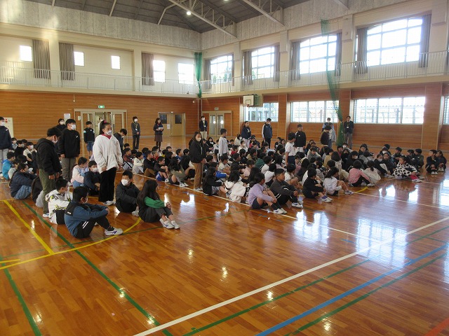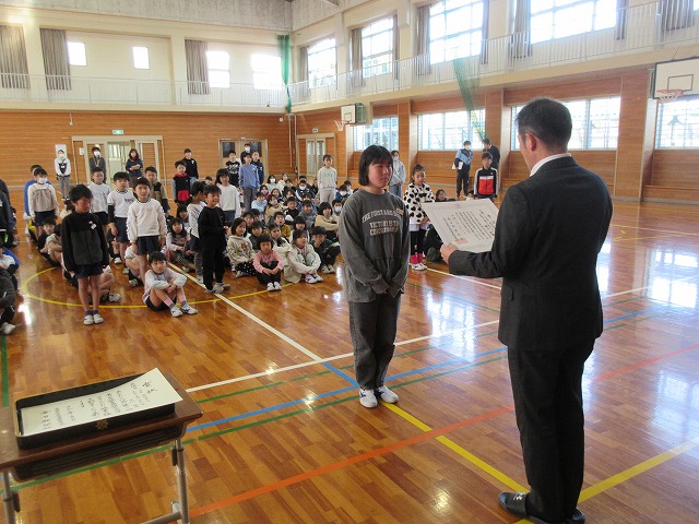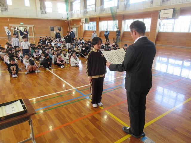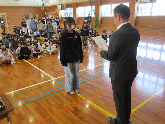 3月13日(金)、朝から伝達表彰を行いました。今回は、読書感想文・画、セミナリヨ版画展、西望賞教育美術展、明るい選挙書道作品展、さらにミニバスケットボール大会など盛りだくさんの内容でした。本当は一人ひとりに校長先生から手渡しで渡したかったのですが、延べ人数で104名と1団体の表彰でしたので、各部門ごとに一人ずつ呼名してその場に立たせ、その中の代表1名に表彰状を手渡しました。残りの児童には教室で手渡しました。それでも朝の活動の時間ぎりぎりでした。また今回は、市から県、さらに九州や全国まで上がっていった作品が2つもありました。すごいことだと思います。例年、画については「すぎたに基金」から額縁を購入してもらい、1年間校内に展示をするようにしているのですが、今回は作品が多いため、また新たに展示場所をふやさなければならないのではないかという、ありがたい悩みに頭を悩ませております。